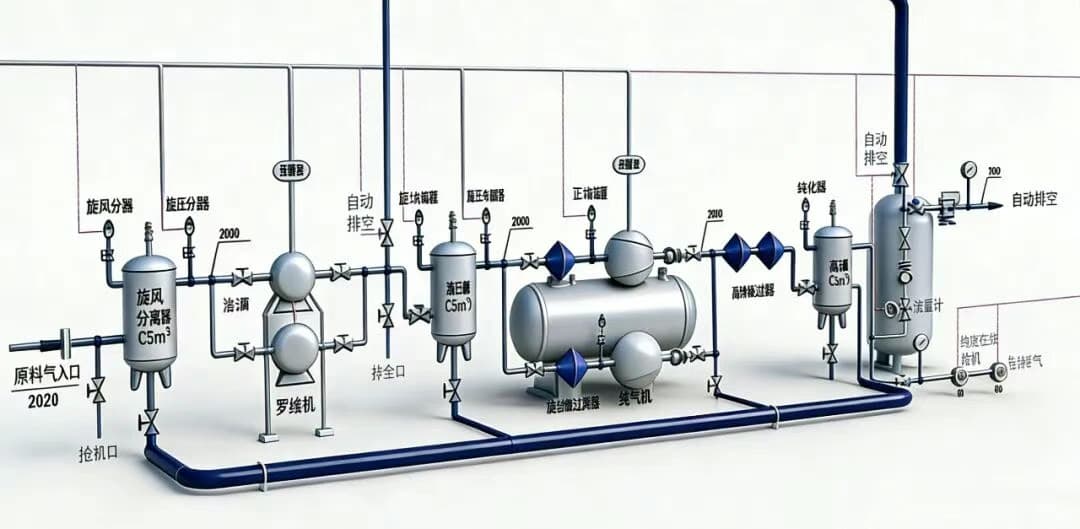预处理模块负责去除回收氮气中的乙炔、水分、油污等杂质,防止污染后续设备或影响氮气纯度。预处理流程包括:被污染气体通过气罐缓冲、低压螺杆机压缩、低压储存、过滤、除水、除油,然后进入纯化器提纯至99.999%,..终通过增压机增压至一定压力的回收系统,依次循环。