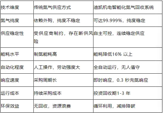 相较于传统的氮气供应方式,迪凯机电智能化氮气回收系统在多个技术维度上具有优势。